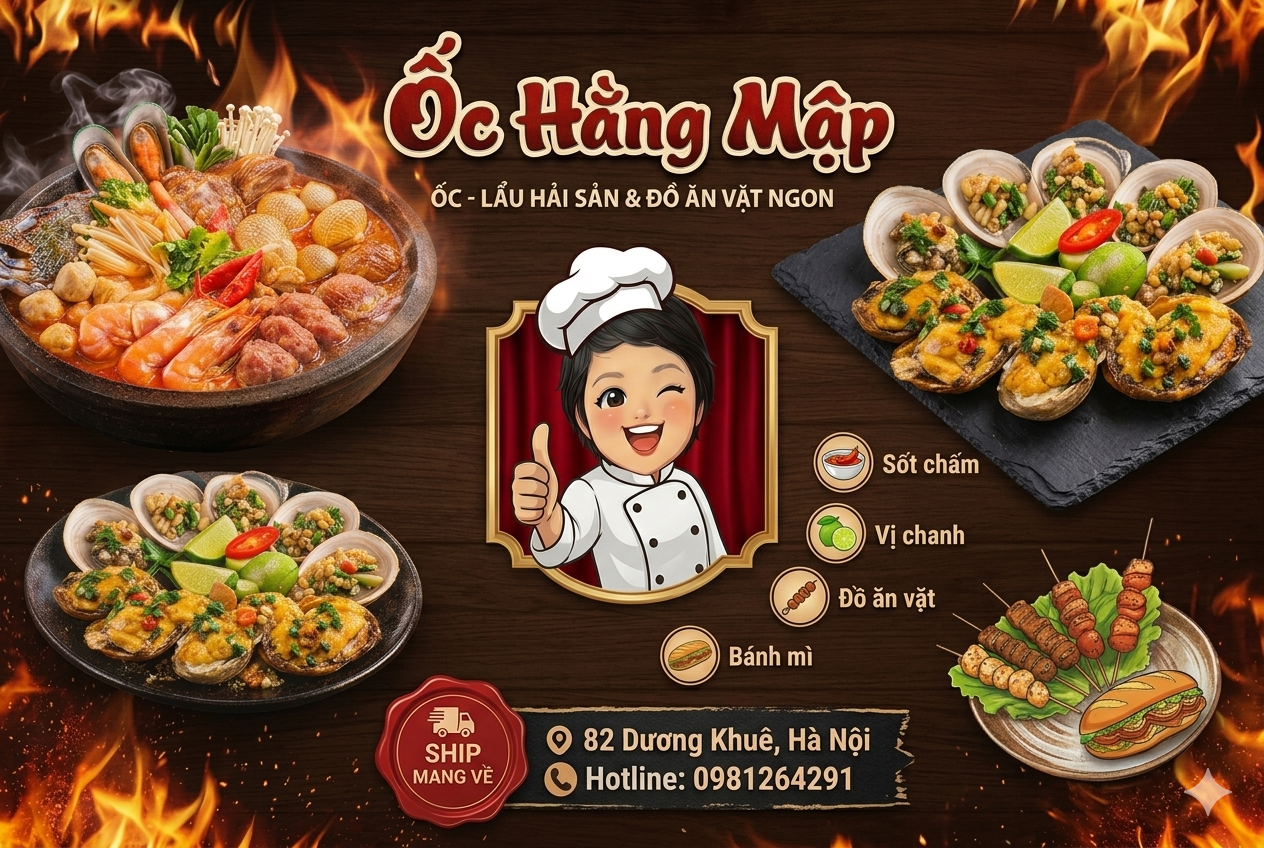 Ốc Hằng Mập Sài Gòn – Lẩu Hải Sản & Đồ Ăn Vặt Ngon là điểm đến quen thuộc dành cho những tín đồ mê hải sản và các món ăn vặt đậm chất đường phố Sài Gòn. Quán nổi bật với thực đơn phong phú từ các loại ốc tươi ngon, lẩu hải sản hấp dẫn đến những món ăn vặt “gây nghiện” như chân gà, cánh gà, đồ chiên giòn… Tất cả đều được chế biến đậm đà, hợp khẩu vị, mang lại trải nghiệm ẩm thực vừa ngon miệng vừa gần gũi. Không gian quán thoải mái, giá cả hợp lý cùng phong cách phục vụ thân thiện cũng là điểm cộng giúp Ốc Hằng Mập trở thành lựa chọn lý tưởng cho những buổi tụ tập bạn bè hay ăn uống thư giãn sau giờ làm.
